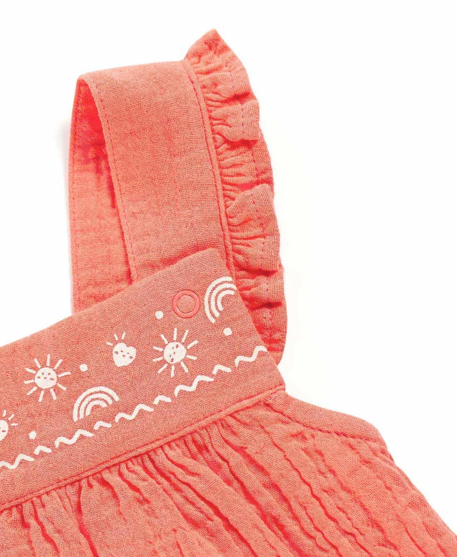 La robe en gaze de coton, douce et aérée, est sublimée par un empiècement à imprimé exclusif et des bretelles volantées réglables pour un ajustement parfait. Le body uni complète l’ensemble avec praticité et style.