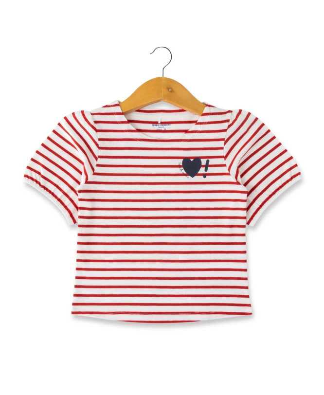 • Léger, respirant et agréable au toucher, un véritable essentiel. Marinière manches courtes Col rond Rayé bicolore Manches bouffantes Bas de manches élastiqués Logo imprimé poitrine Existe en plusieurs coloris