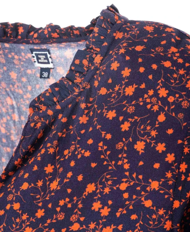 100 % VISCOSE -manches longues élastiquées au poignet – col rond avec échancrure en V – bordure plissée sur le col -plis au niveau de la poitrine – 1 volant plissé au bas de la robe -doublure