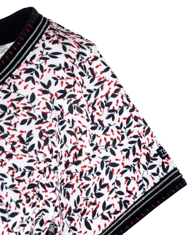 Imprimé rouge et marine en jersey motif feuilles et petits poissons