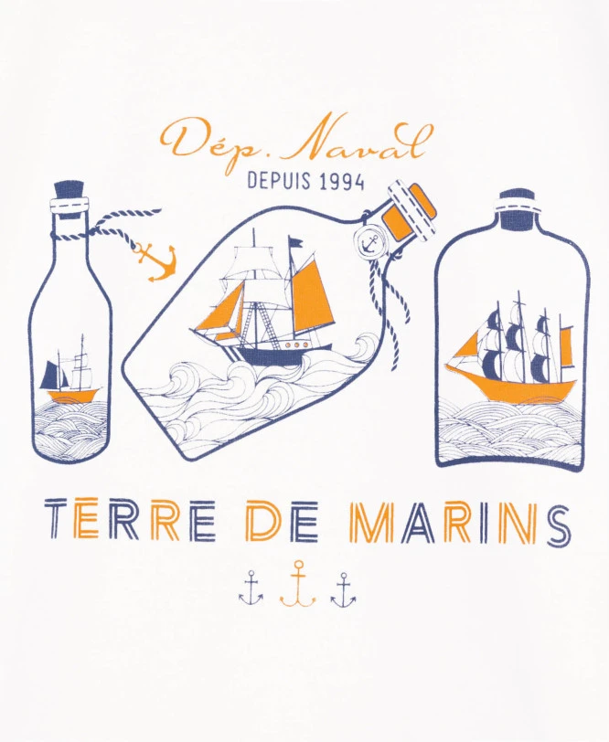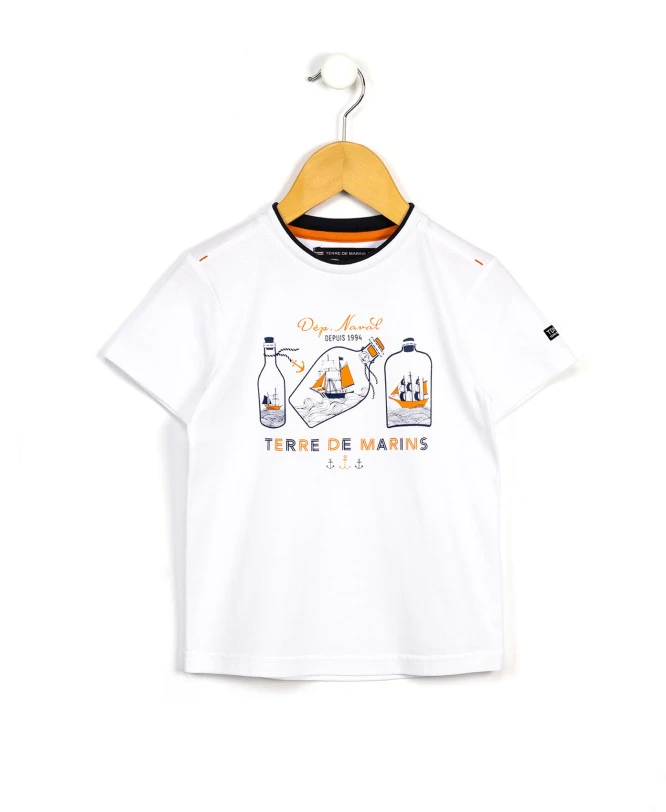 Tee-shirt manches courtes garçon blanc -100% coton -Jersey blanc – Devant avec motif original corail et bleu – col rond blanc avec bordure marine – Dos et manches unies blanc – Un T-shirt facile à coordonner avec tous les bas et très original par son motif « bouteille à la mer » ! En route pour la chasse au trésor moussaillon !