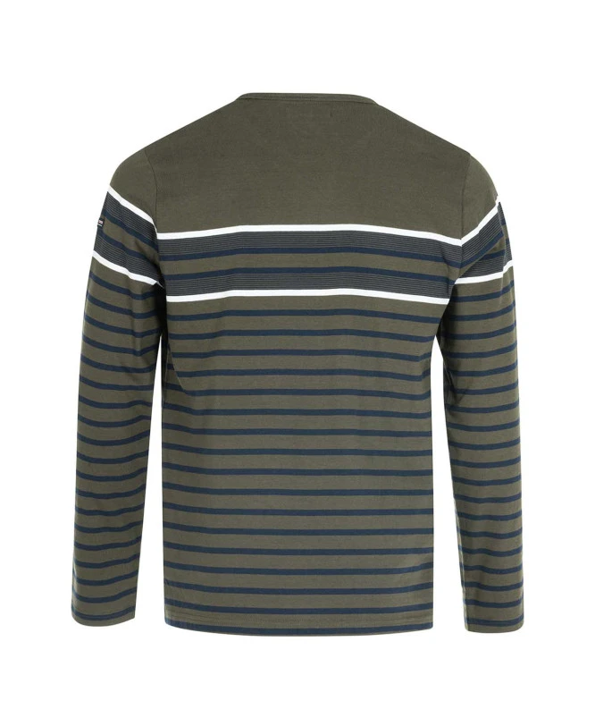 T-shirt manches longues kaki à rayures bleues et blanches pour homme. Col rond. Ecusson sur la manche gauche et logo sur le torse coté coeur. Matière jersey 100% coton naturelle agréable 240 gsm. Ce T-shirt manches longues MAKAKI est un incontournable de la garde robe d’un homme, et se porte facilement avec un dneim.