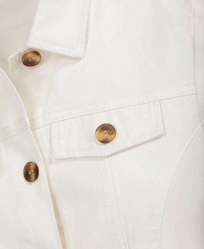 Un indispensable du printemps : la veste en jean blanche. A porter sur un top coloré, en association avec un short ou un pantalon léger.
